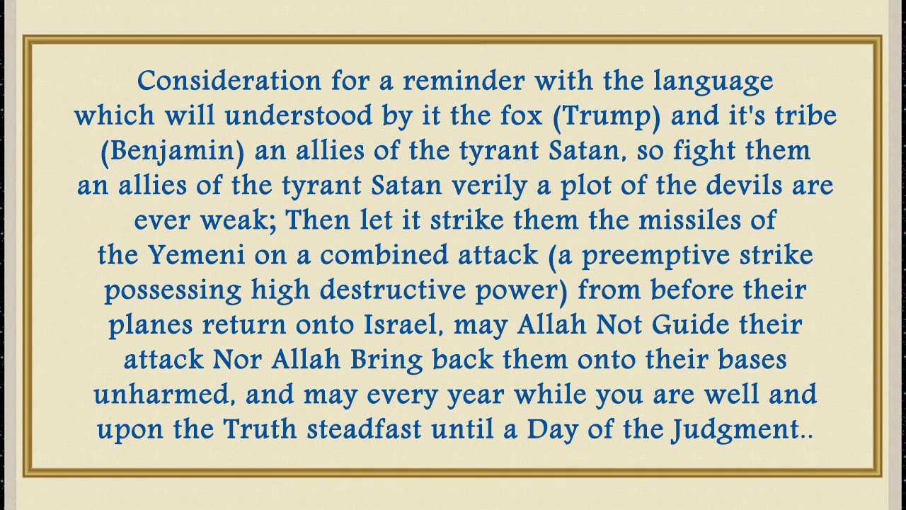 A reminder with the language which will understood by it the fox (Trump) and it's tribe (Benjamin) an allies of al-Taghoot, so fight them an allies of al-Taghoot verily a plot of the satans are ever weak; Then let it strike them the missiles of the Yemeni on a combined attack (a preemptive strike possessing high destructive power) from before their planes return onto Israel, may Allah Not Guide their attack Nor Allah Bring back them onto their bases unharmed, and may every year while you are well and upon the Truth steadfast until a Day of the Judgment..