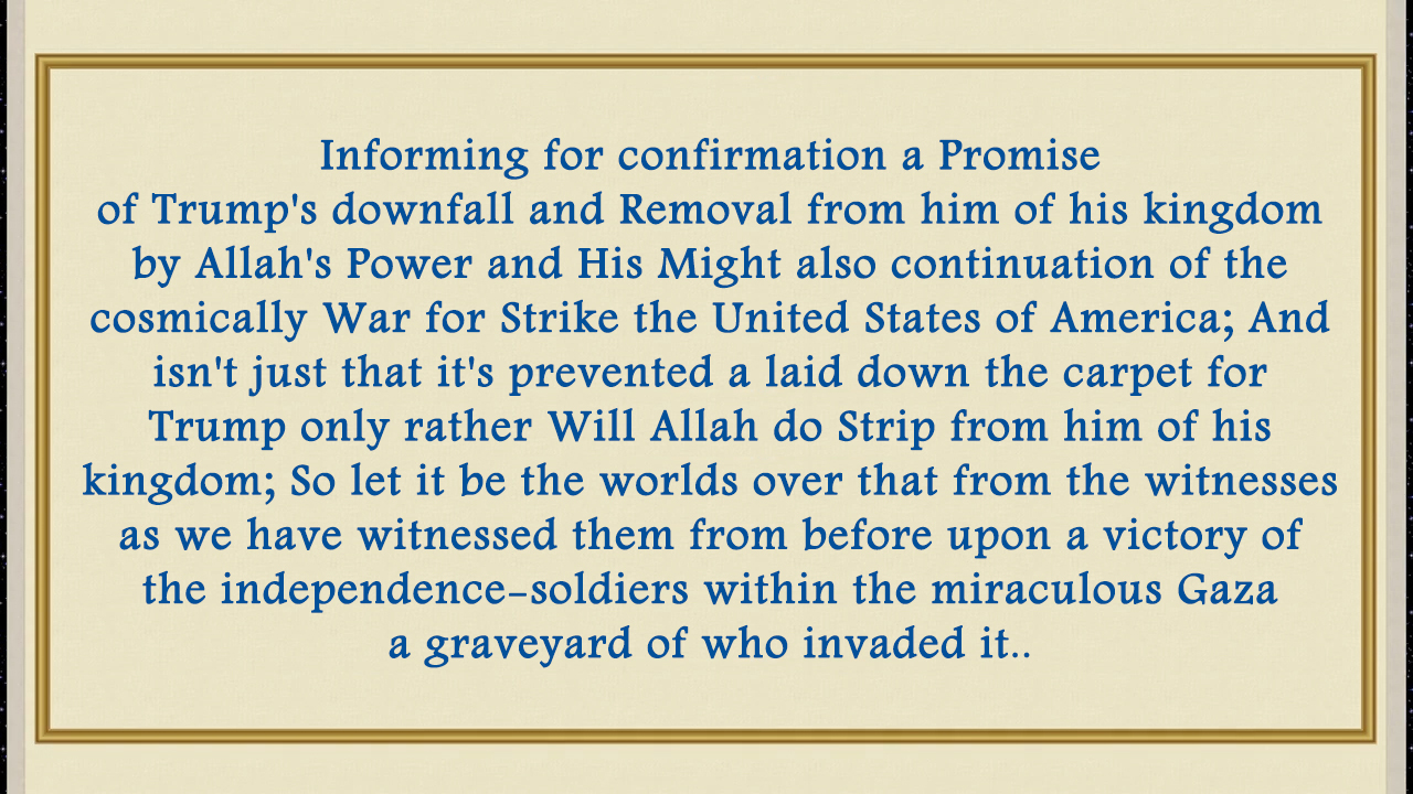 Informing for confirmation a Promise of Trump's downfall and Removal from him of his kingdom by Allah's Power and His Might also continuation of the cosmically War for Strike the United States of America; And isn't just that it's prevented a laid down the carpet for Trump only rather Will Allah do Strip from him of his kingdom; So let it be the worlds over that from the witnesses as we have witnessed them from before upon a victory of the independence-soldiers within the miraculous Gaza a graveyard of who invaded it..